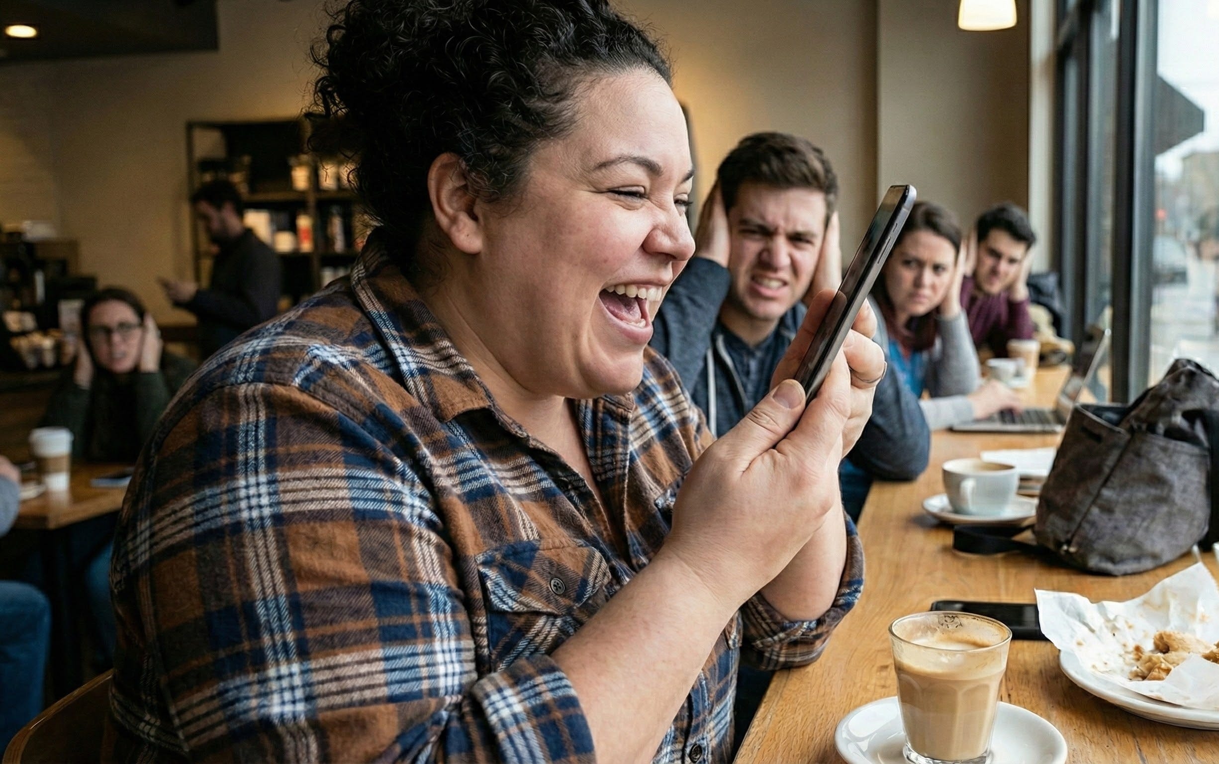 She jammed her oversized iPhone Pro MAX into her face, which was about the size of a dinner plate. No headphones. Speakerphone at maximum volume.